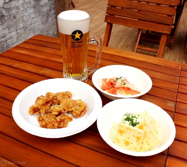 ビアガーデンでは、パーフェクト黒ラベルに合うフードメニューを用意。「秘伝!鶏の唐揚げ」「スモークサーモンと新玉葱のマリネ」「ハムチーズエッグ」といった数種類の料理を注文できる。