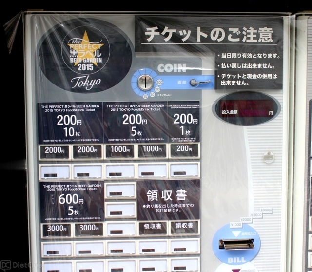 店舗内での飲食は食券が必要。入店前に券売機で食券を購入し、ビアガーデン内の窓口で、生ビールや料理と引き換えるシステムになっている。食券は、200円券と600円券の2種類がある。