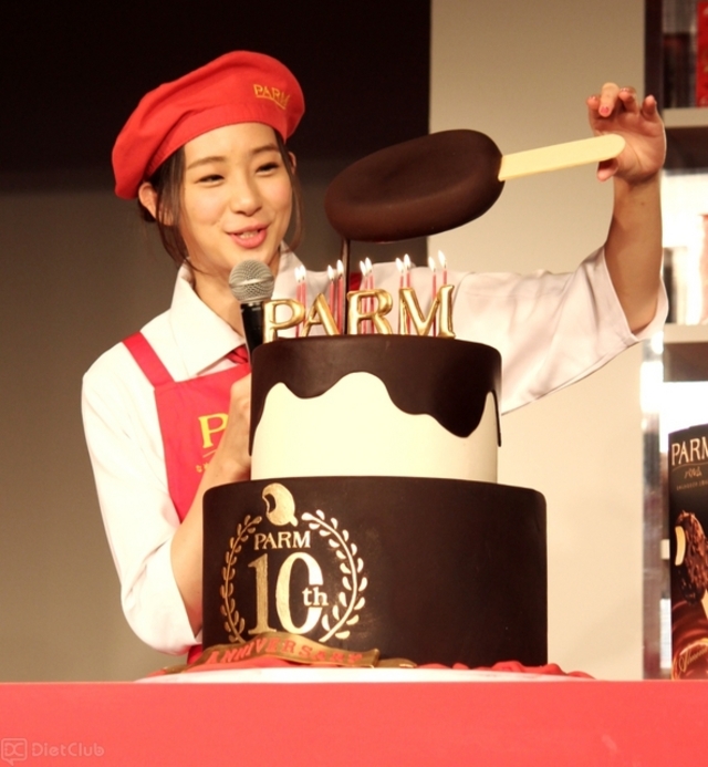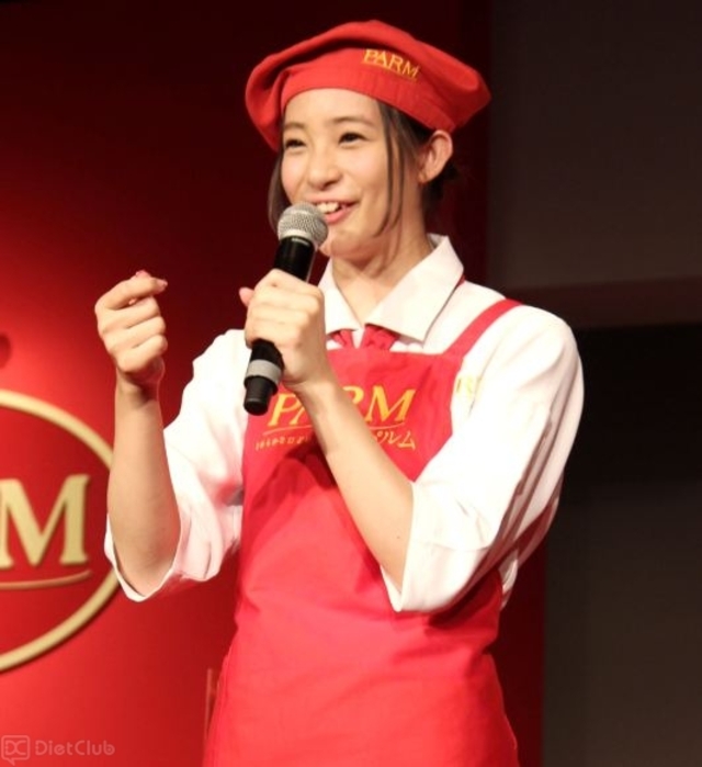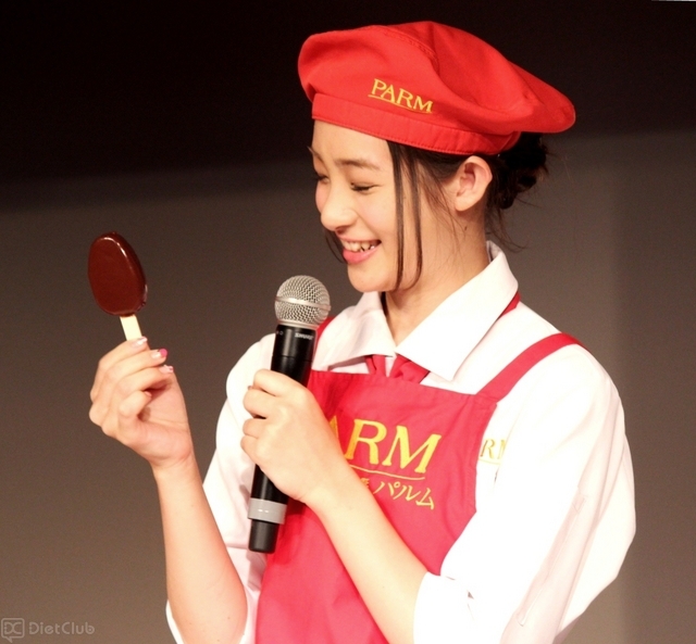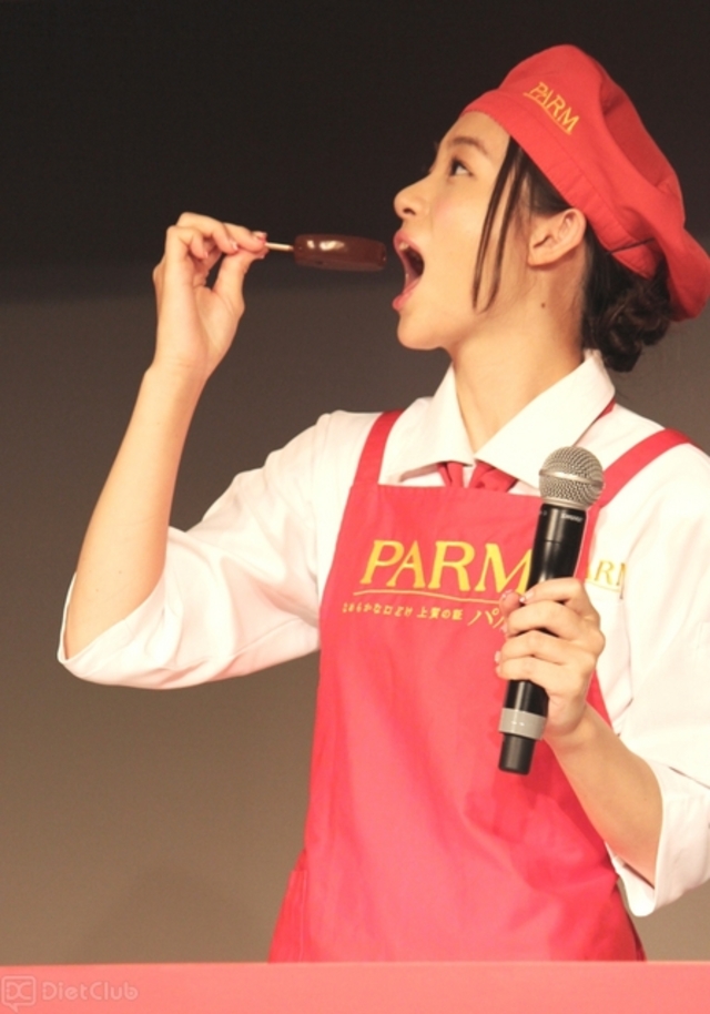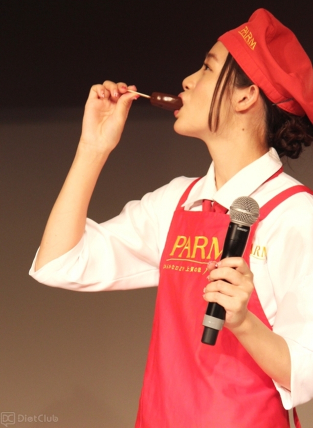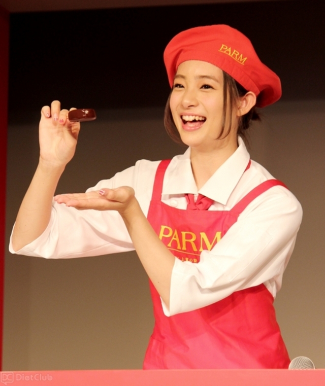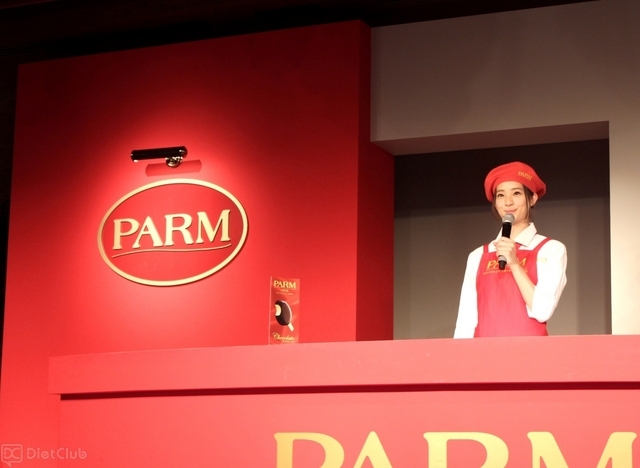 今回の発表会には、商品CMに出演している、女優の足立梨花が登場。足立は、店内に特設されたショップカウンターで、PARMのチョコ付け体験を行い、その場で試食して「おいしい!」と大絶賛していた。