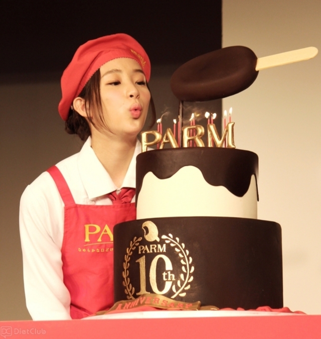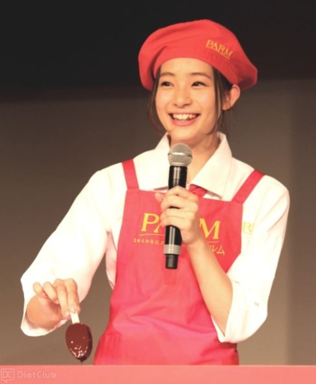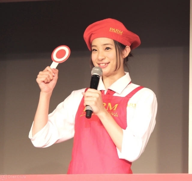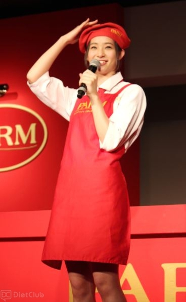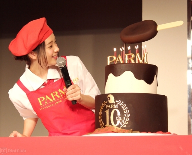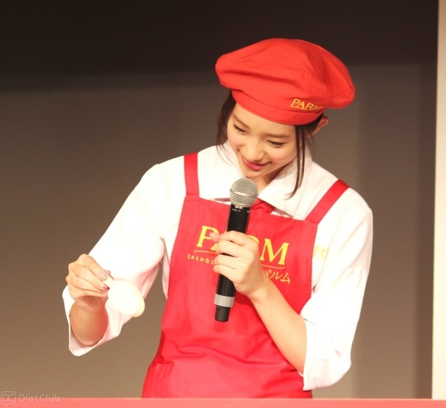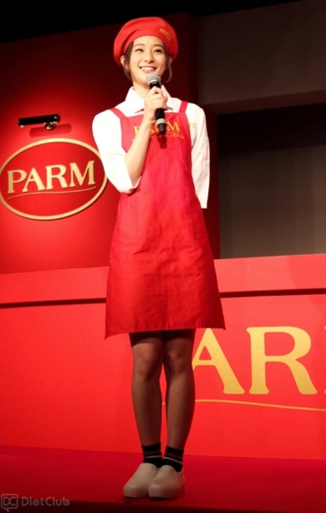 今回の発表会には、商品CMに出演している、女優の足立梨花が登場。足立は、店内に特設されたショップカウンターで、PARMのチョコ付け体験を行い、その場で試食して「おいしい!」と大絶賛していた。