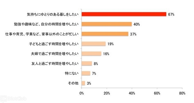 そこで、「時短」が必要な理由を尋ねたら、67%の人が「気持ちにゆとりのある暮らしをしたい」と回答。それ以外では、「勉強や趣味など、自分の時間を増やしたい(40%)」「仕事や育児、学業など、家事以外のことが忙しい(37%)」などの回答もあった。
