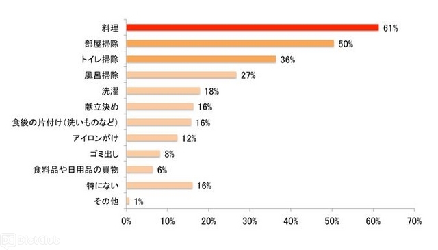 また同調査で、『家族や友人から「手抜きをしている」と思われたくない家事があれば教えてください』という質問では、61%の人が「料理」と回答してトップになり、2位は「部屋掃除」、3位は「トイレ掃除」だった。