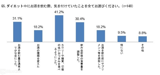 続いて、ダイエット中にお酒を飲む際、気を付けていたことを聞くと、「カロリーや糖質の値の低いおつまみを食べるようにした」という人が最も多かった。そして、「お酒を飲む量を通常より少な目にした」「飲み会前後の食事量を調整した」と回答した人も多かった。