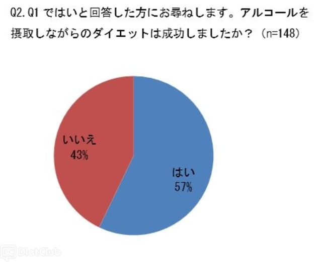 同調査で、「ダイエット中にもアルコールを飲んでいましたか?」と質問したところ、76%の女性が「はい」と回答し、その回答者のうち、57%が「アルコールを摂取しながらのダイエットに成功した」と答えたという。