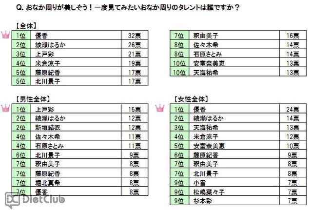 続いて、「あなたが見てみたいおなか周りのタレントは?」という質問の総合第1位は、最近痩せてキレイになったと話題の優香。そのほか、上戸彩、綾瀬はるか、天海祐希ら、あまりおなか周りを見る機会のない女優陣が名を連ねる結果となった。