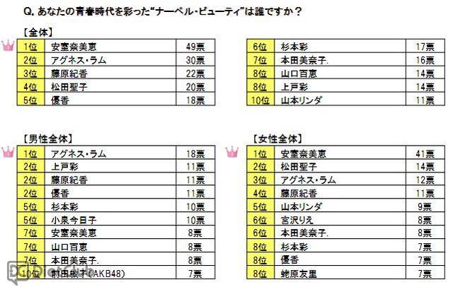 青春時代を彩った“ナーベル・ビューティー”は誰か? という質問では、総合第1位、女性第1位は安室奈美恵だったのに対し、男性は懐かしのグラビアクイーン、アグネス・ラムが第1位。安室奈美恵は20~30代の女性の圧倒的な支持を得たが、男性部門では「とにかく可愛くてスタイル抜群だった(50代男性)」「程よくくびれたウエストで健康的に焼けた肌が魅力的(40代女性)」と、アグネス・ラムに中高年の熱烈なラブコールが寄せられた。