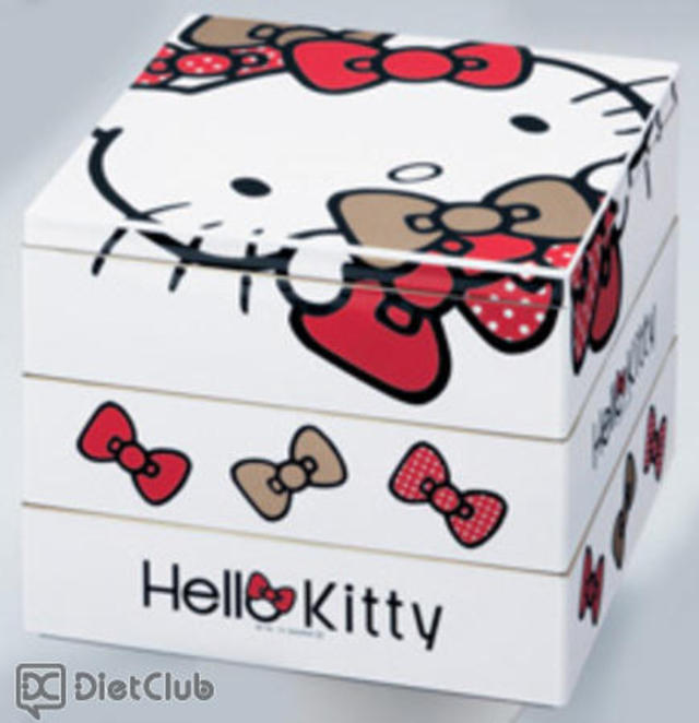 料理は祝い肴の黒豆や田作り、なます、あわび、スイーツなどのほかに、キティ柄のかまぼこや高野豆腐が入っており、重箱の中までキティ尽くしの内容になっている。
