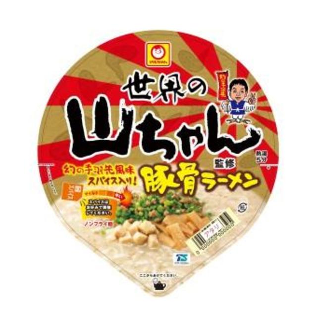 「『世界の山ちゃん』監修 豚骨ラーメン」は、ポークエキスをベースにした豚骨スープに、「世界の山ちゃん」の『幻の手羽先』風味の特製スパイスが付いている。具材はメンマ、鶏肉ダイス、ひき肉、ねぎ。