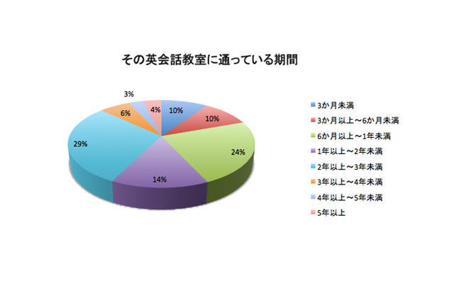 一方、オンライン英会話では3か月未満が30%の最多で、これに3か月以上~6か月未満の20%、6か月以上~1年未満の16%が続いた。オンライン英会話は最近になって注目されていることもあるが、通学型の英会話教室に比べ、継続期間が短い結果となった。