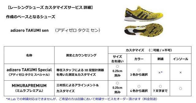 同スペースでは、「adizero TAKUMI Special(アディゼロ タクミ スペシャル)」と「MIMURAPREMIUM(ミムラプレミアム)」の2種類のカスタマイズサービスが受けられる。カスタマイズのベースとなるシューズは、レーシングモデルである、三村氏とアディダスで共同開発した「adizero TAKUMI sen(アディゼロ タクミ セン)」が対象。