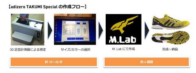 「adizero TAKUMI Special(アディゼロ タクミ スペシャル)」は、専任のスタッフが3D足型計測器で測定したランナーの足型をもとに、三村氏の工房である M.Lab(ミムラボ)で、より足にフィットしたカスタマイズシューズを作成するサービス。シューズは左右の足のサイズ・足幅の違いに対応し、価格は21,000 円。