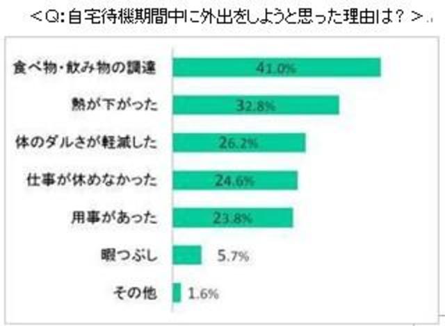 外出をした理由としては「食べ物・飲み物の調達のため」というケースが最も多かったが、「熱が下がったから」、「体のダルさが軽減したから」という、他人にうつすことへの意識が低いと思われる理由での外出も高い結果が出た。また、「仕事が休めなかったから」との回答も24.6パーセントと多い。