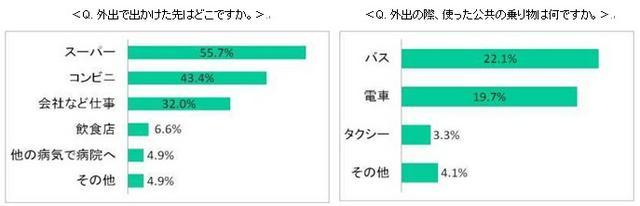 外出時の行き先で、最も多かったのは「スーパー」の55.7パーセント、次に「コンビニ」の43.4パーセントとなった。また「会社などの仕事」も32パーセントと多く、会社で同じ空間にいることになる同僚や、ミーティングを行った取引先などにウイルスが拡散されていると予想される。