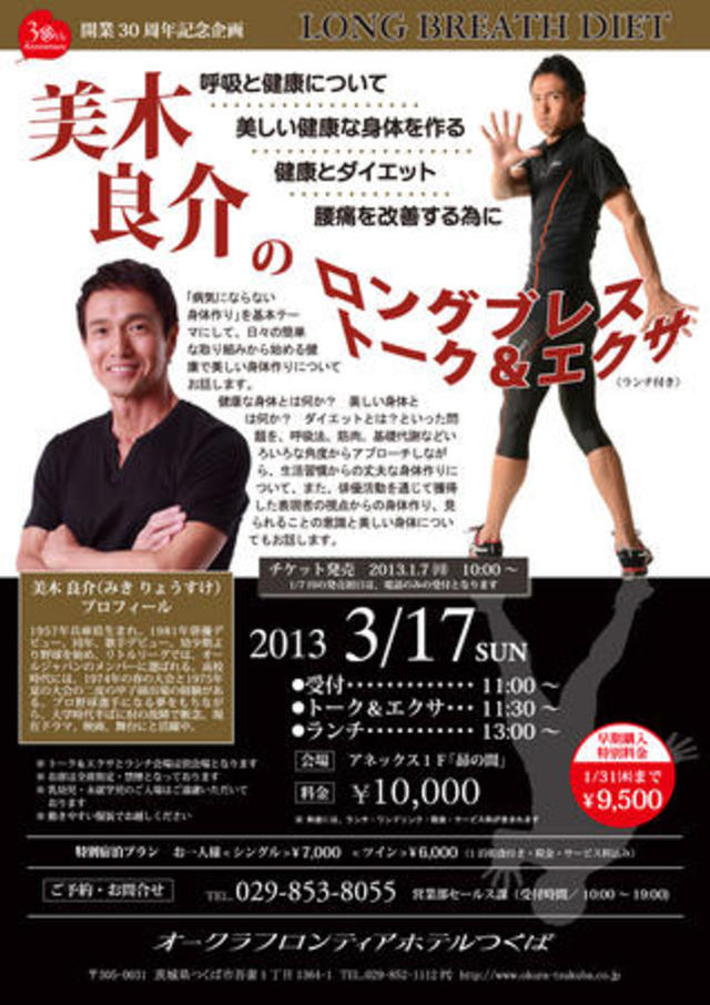 オークラフロンティアホテルつくばで、「ロングブレスダイエット」の美木良介氏を招き『美木良介のロングブレス トーク&エクサ』が開催される。