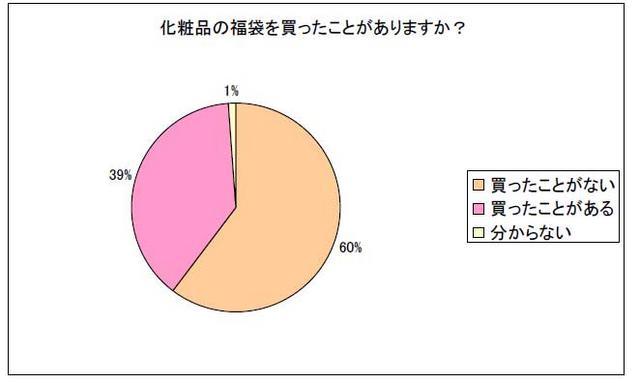 どんな福袋を買いたいかという質問には、1位「洋服」43パーセント、2位「化粧品」24パーセントという結果になった。化粧品の福袋を買ったことがあるかとの質問には、「買ったことがない」が60パーセントで、「買ったことがある」の39パーセントを上回る結果になった。