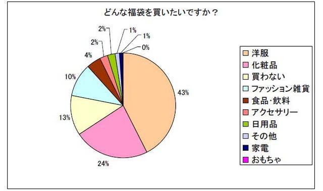11月9日から16日の間、Webにて、3422人の女性にアンケートを行った結果によると、2013年の福袋を買う予定の人は50パーセントで、買うかどうか分からない人は34パーセント、買わない予定の人は16パーセントという結果になり、半数の人が福袋を買う予定ということがわかった。