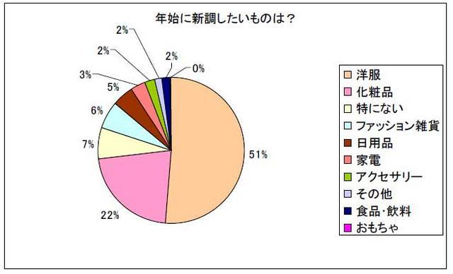 年始に新調したいものを聞いたところ、1位が「洋服」で51パーセント、2位が「化粧品」で22パーセントという結果になった。年始に、洋服や化粧品などを新調したいと思っている人が多いようだ。