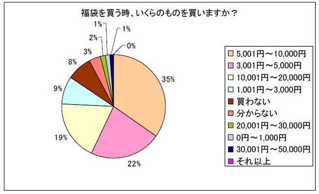 福袋を買う時、いくらのものを買うかという質問には、1位が「5,001円~10,000円」の35パーセント、2位が「3,001円~5,000円」の22パーセント、3位は「10,001円~20,000円」19パーセントという結果になり、高すぎない価格の福袋が人気のようだ。