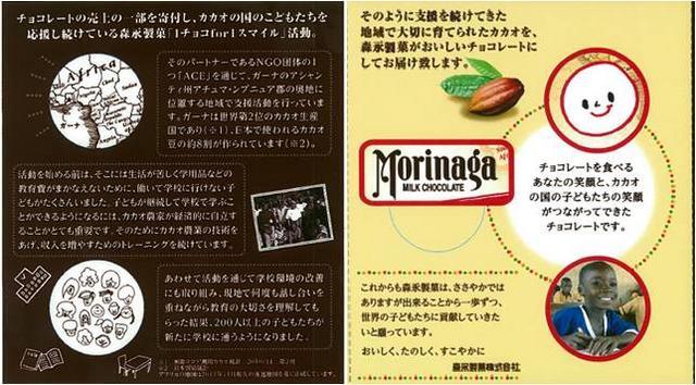 同社は、創業110周年を記念したCSR活動として、お客様と一緒に子供たちの笑顔のための売上連動型コーズプロモーション(社会的大義を訴求して参加を促す販促手法) 「1チョコfor1スマイルキャンペーン」を、2008年から開始している。国際協力NGOの活動支援を通じて、対象商品1つにつき1円を、カカオ生産国における子供たちの教育支援とカカオ農家の自立支援活動に充てる活動を行ってきた。