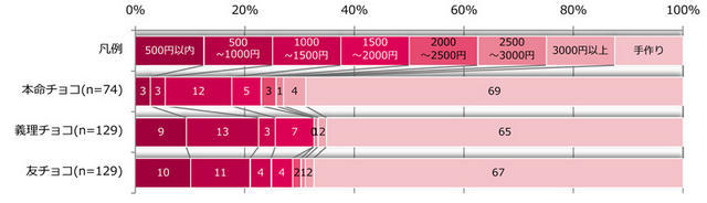 チョコを手作りする割合は、本命チョコも義理チョコや女友達にあげる友チョコも約70パーセントと、チョコは『手作り』が女子中高生の間では主流のようである。また、手作り派以外の予算額は、義理・友チョコは500~1,000円、本命チョコは義理・友チョコよりも1ランク高い1,000~1,500円が最も多い結果となった。