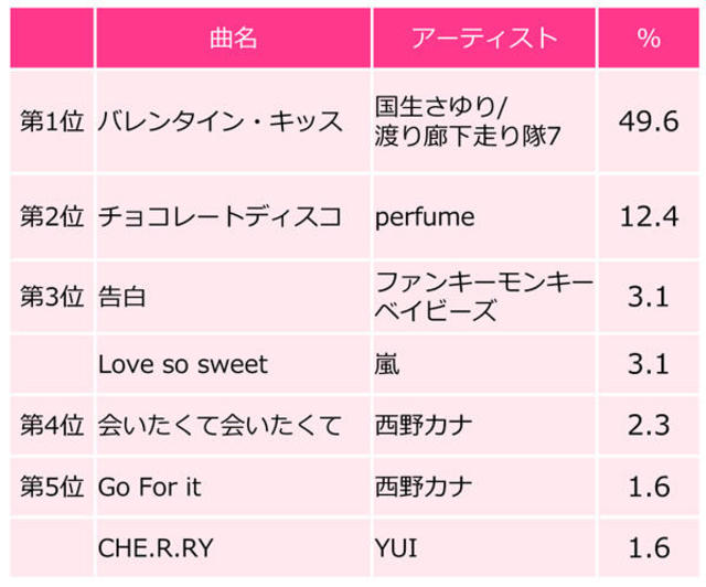 「バレンタインデーと言われて思い浮かぶ曲、聞きたい曲」は、「バレンタイン・キッス」が断トツの1位だった。同曲は、秋元康氏が作詞、1986年に国生さゆりがおニャン子クラブ在籍中に出したソロデビューシングル。25年後の2011年にはAKB48のメンバーで構成される「渡り廊下走り隊7」がカバーしたこともあり、女子中高生からもバレンタインの定番曲として知られている。