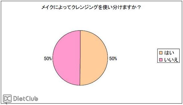 クレンジングをいくつ持っているかとの質問には、1位「2つ」が42パーセント、2位「1つ」34パーセント、3位「3つ」17パーセントという結果になった。クレンジングを複数持っている人が64パーセントと半数以上だった。メイクによってクレンジングを使い分けるかとの質問には、「はい」50.4パーセント、「いいえ」49.6パーセントという結果になった。メイクによってクレンジングを使い分けている方が半数だった。