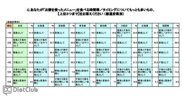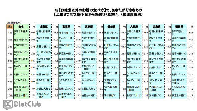 調査結果をエリア別で見ると、「海苔で巻いて」食べる支持率は、宮城で58.2パーセントとなったが、西に移動するにつれて支持率は減少傾向にあり、大阪と広島、福岡に至ってはいずれも4位で、支持率は3割未満となった。これらの3府県では「砂糖とお醤油で」「きなこを付けて」「お汁粉/ぜんざい」が上位3つを占めている。福岡では「きなこを付けて」の支持率が52.8パーセントと、過半数を超えて1位となっている。