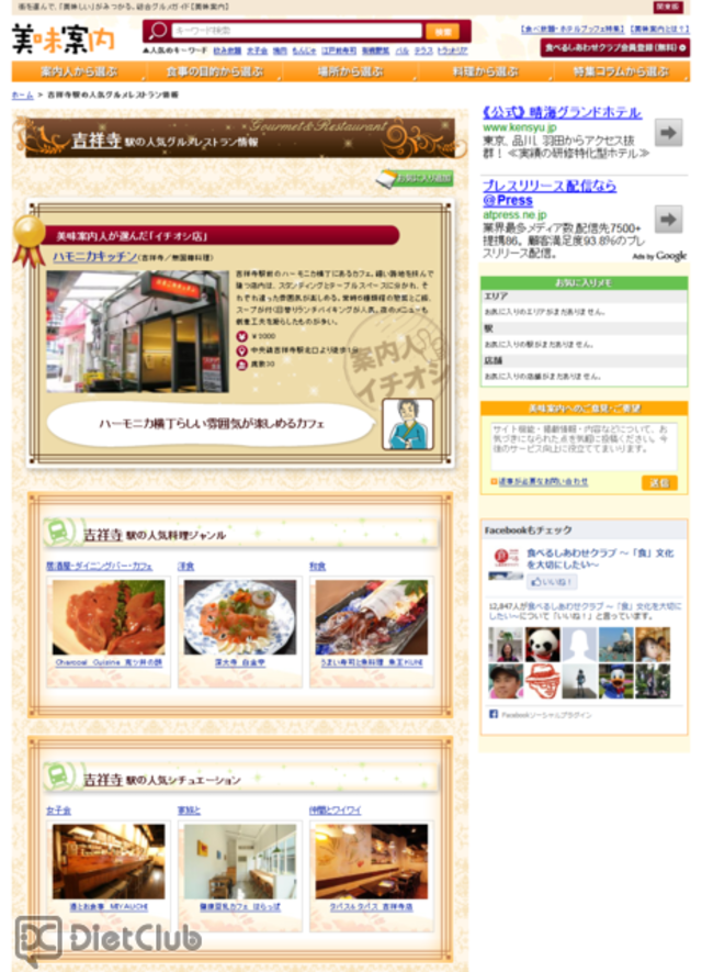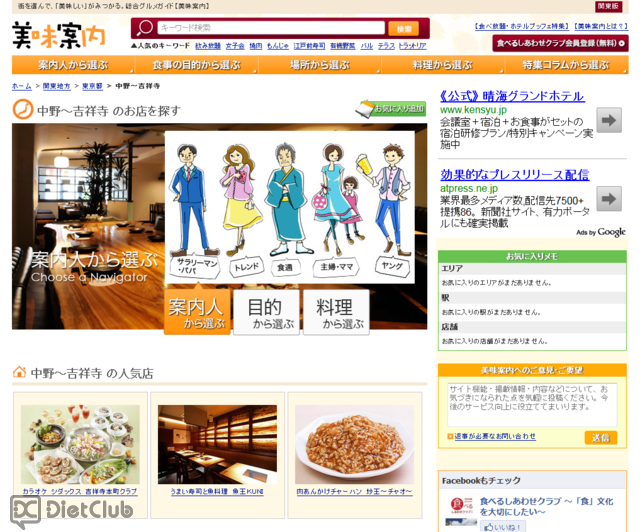 同サイトは、飲食店検索サイト『グルメぴあ』の飲食店情報に、『乗換案内』のサービスとノウハウを結びつけ、双方の強みをいかした総合グルメサイト。ユーザーは行きたい場所を選ぶと、「案内人から選ぶ」、「目的から選ぶ」、「料理から選ぶ」という3つの検索方法が表示される。