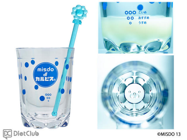 さらに、カルピスのトレードマークでもある水玉模様と、ミスタードーナツのオリジナルキャラクター「ポン・デ・ライオン」と「フレンチウーラー」をデザインした『misdo×カルピス』グラス&マドラーと、ドーナツやドリンクとのセットも提供。グラスには、カルピスをつくるときに便利な、濃度調整用のドーナツ柄の目盛がついている。
