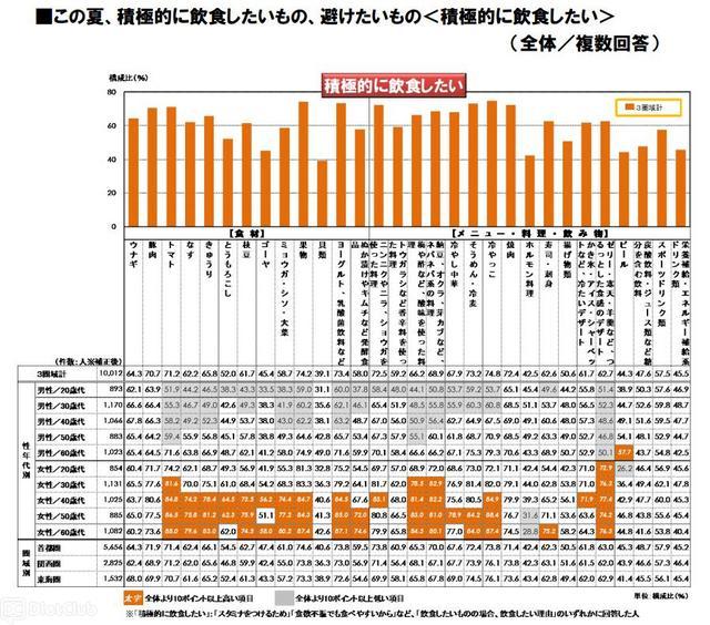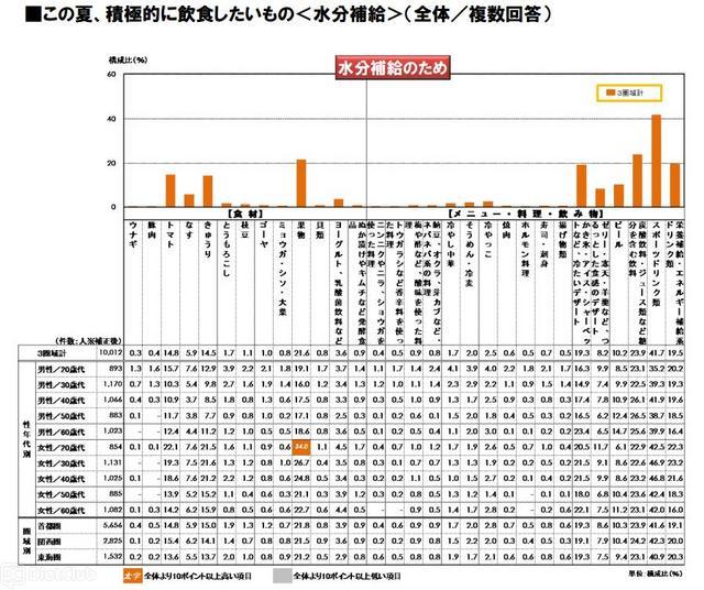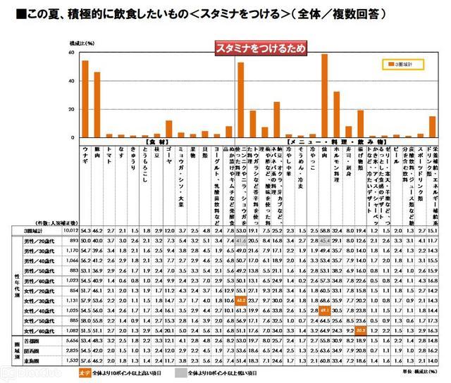 目的別で多くの回答が寄せられた「食欲不振でも食べやすいから」「スタミナをつけるため」「水分補給のため」の3項目では、食欲不振には「そうめん・冷麦(51.0%)」、スタミナ対策には「焼肉(58.8%)」、水分補給には「スポーツドリンク類(41.7%)」が各目的別で1位となっている。