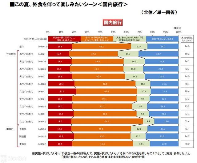 日本の夏のレジャー15種類について、参加意向と参加における外食目的の強さについて、意識調査を行った。首都圏・東海圏・関西圏の3圏域計で参加意向最多は「国内旅行」が最も多く76.0%だった。次いで、「花火大会」が3圏域計で67.0%、「盆踊り・夏祭り」が57.4%と続いている。