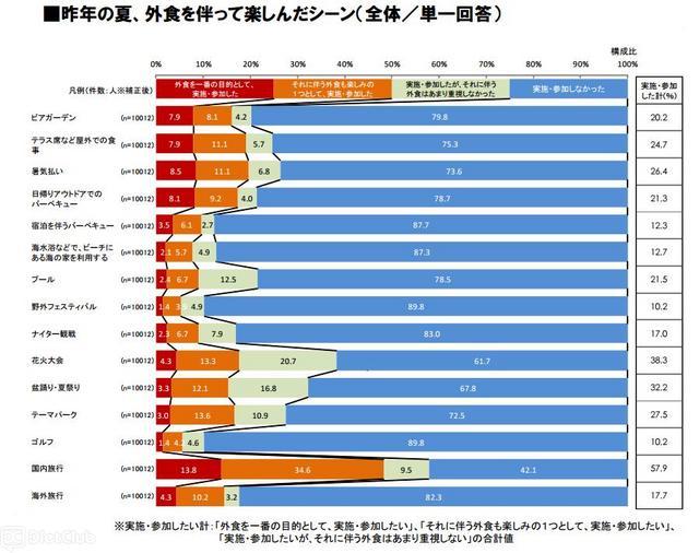 また、昨年行ったアンケート結果と今年の参加意向を比較すると、もっとも差が大きいのが「テラス席など屋外の食事」の29.0ポイント(昨年24.7%が今年53.7%)で、以下「花火大会」が28.7ポイント(38.3%が67.0%)、「日帰りアウトドアでのバーベキュー」が27.2ポイント(21.3%が48.5%)と続いている。