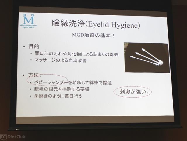 そこで坪田氏と戸田氏は、MGDやドライアイを防ぐ方法のひとつとして、まつ毛の根もとを習慣的に洗浄することを薦めていた。