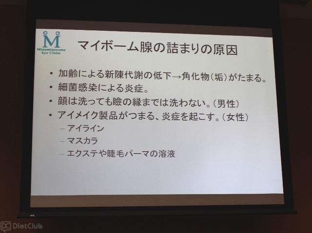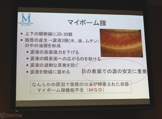 同セミナーでは、慶応義塾大学 医学部 眼科学教室教授の坪田一男氏と、南青山アイクリニック東京 理事長の戸田郁子氏による講演を実施。両者は、まつ毛の根もとに汚れが溜まることで発症する「マイボーム腺機能不全(MGD)」や不衛生なまつ毛に発生するダニ(顔ダニの一種であるデモデックス)が「ドライアイ」の原因になると話した。