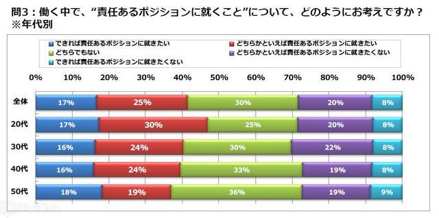 続いて、『働く中で“責任あるポジションに就くこと”について、どのようにお考えですか?』という問いには、「できれば責任あるポジションに就きたい」、「どちらかといえば責任あるポジションに就きたい」と回答した人の合計が42%だった。