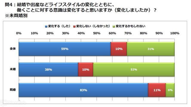 このほか、『結婚や出産などライフスタイルの変化とともに、働くことに対する意識は変化すると思いますか(変化しましたか)?』と聞くと、59%が「変化する(した)」と答え、31%が「変化するかもしれない」と回答した。