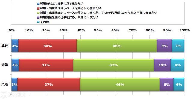 そこで回答者たちに『どのような変化だと思いますか?』と質問したところ、46%の女性が「結婚・出産後は少しペースを落として働くが、子供の手が離れたら以前と同様に働きたい」と答え、ライフスタイルの変化に合わせて働き方が変わったとしても、働くことを希望する女性が多いことが明らかになった。