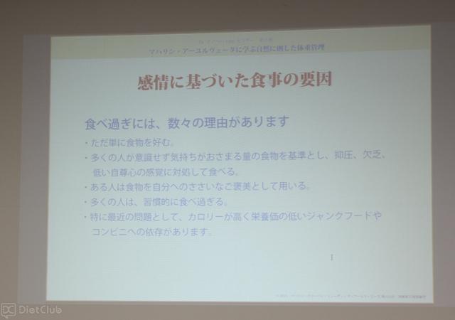 このほか、「感情に基づいた食事の要因」や「ストレスを減少させる手段」、「バランスの乱れの予防と健康増進のための運動」なども紹介され、セミナー参加者たちはメモを取りながらマノハ・パラクルティ氏の話を聞いていた。