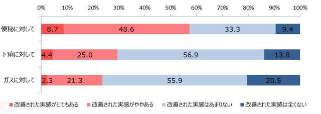 そこで、ヨーグルトを摂取することで不調が改善されたか、その実感について聞いてみた。すると、「便秘」に対して改善された実感があると答えた人は57.3%だったが「下痢」に対して効果を実感している人は29.4%という結果に。「ガスのたまりやすいこと」に対しては23.6%だった。