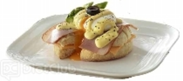 エッグベネディクトは、チーズを挟んだマフィンに、ポーチドエッグとベーコンをのせ、オランデーズソース(バター・レモン果汁・卵黄をベースに、塩・こしょう等で味付けしたもの)をかけた。さらに、アスパラ・オリーブ・ブラックペッパーをトッピングし、温めると黄身とチーズのとろとろ感とマフィンの「モチモチ感」を楽しめる。