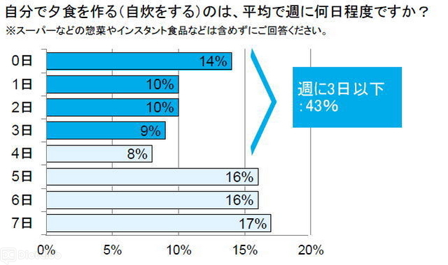 働く女性に、「自分で夕食を作る(自炊をする)のは、平均で週に何日程度ですか?」と聞いたところ、「毎日(週7日)」と答えた人はわずか17%にとどまった。また、夕食を自分で作る頻度が 『週の半分以下』という女性が多くを占め、「週に3日以内」と回答した人は43%と4割を超えた。