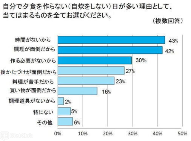 夕食を自分で作る日が「週に3日以内」と答えた人に、「自分で夕食を作らない(自炊をしない)日が多い理由」を聞いたところ、「時間がないから」(43%)、「調理が面倒だから」(42%)などの回答が上位となった。