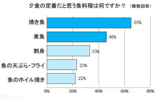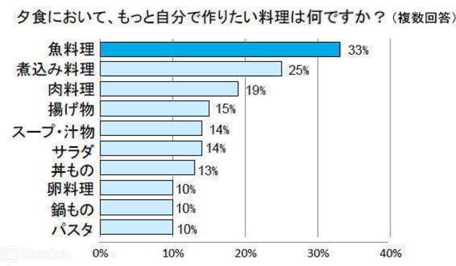 このほか、実際に自分で作りたい夕食のメニューについても調査を行った。「夕食において、もっと自分で作りたい料理は何ですか?」と聞いたところ、最も多かった回答は「魚料理」(33%)という結果になり、「夕食の定番だと思う魚料理」としては、1位が「焼き魚」、2位が「煮魚」となった。