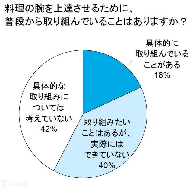 しかし一方で、「料理の腕を上達させるために、普段から取り組んでいることはありますか?」と聞いたところ、「具体的に取り組んでいることがある」と答えた人は18%とわずか1割台にとどまり、多くの人が「取り組みたいことはあるが、実際にはできていない」(40%)、「具体的な取り組みについては考えていない」(42%)と回答した。