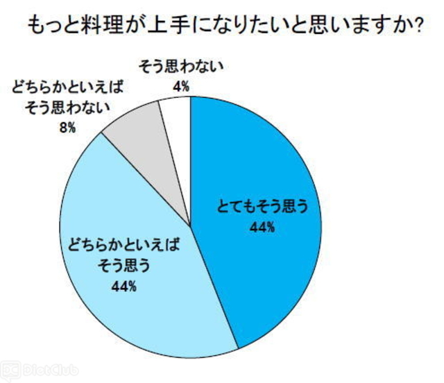 はじめに、自分の「料理の腕前」に対する自信を聞いたところ、「自信がある」と答えたのは、未婚女性で32%、既婚女性でも38%と、いずれも4割に満たない結果であった。そこで「もっと料理が上手になりたいと思いますか?」と聞くと、「とてもそう思う」(44%)、「どちらかといえばそう思う」(44%)の合計が88%と約9割にのぼった。
