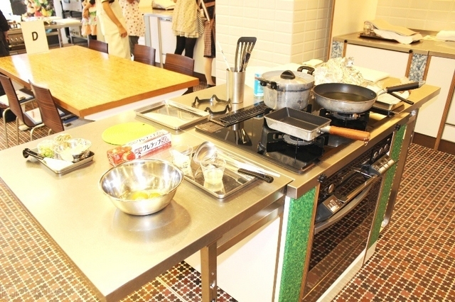 料理教室の会場となったスペースには、料理教室で使用する食材はもちろん、最新の家庭用コンロとガスオーブンを搭載した可動式調理台のほか、6人掛けのテーブルが数セットあり、調理や調理後の試食に必要なものがすべて用意されていた。