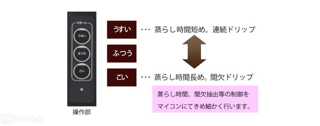 同商品は、湯の抽出時間をマイコンで制御し、少し注いでから抽出を止めて蒸らしを行って、その後にドリップを開始する「マイコン深蒸しドリップ」を搭載。コーヒー粉をしっかり蒸らしてからドリップすることでコーヒーのおいしさを引き出すところが特徴で、好みの濃さが選べる「3段階テイストセレクト」機能も備える。