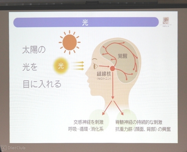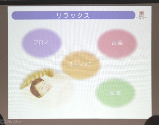 また眠るときは、部屋の明かりを、青白い蛍光灯ではなく、暖色系の間接照明やろうそくにしたり、アロマや音楽、ストレッチ、読書(テーマが軽いもの)でリラックスすることが、質の良い眠りを得る方法だと説明。さらに、朝気持ちよく目覚めるには、太陽の光を目に入れることが大切だと話していた。