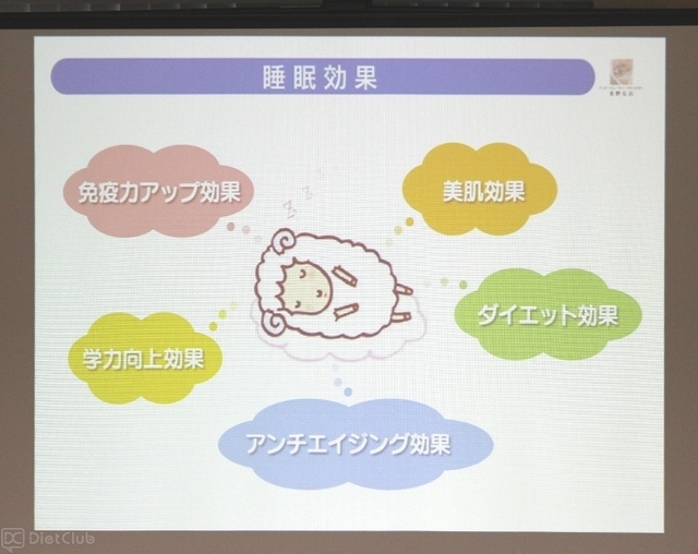 友野氏は、自身の経験を活かした「眠活」を提案しており、朝8時から夜23時までの活動時間帯に起こる、イライラや肌荒れ、肥満、能力低下、疲れなどを、夜23時から朝8時までの9時間に解消することがポイントとのこと。眠る前の1時間、7.5時間の睡眠、起床後30分の過ごし方が体内のメンテナンスにつながり、“質の良い眠り”が、「美肌効果」、「ダイエット効果」、「免疫力アップ効果」、「学力向上効果」、「アンチエイジング効果」を生み出すという。
