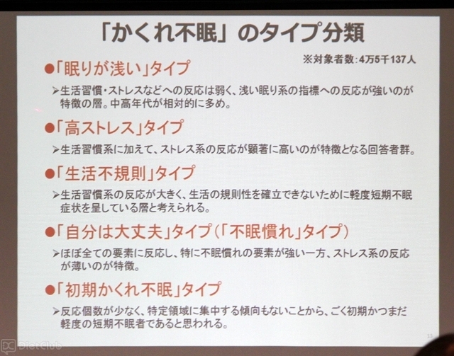また古賀氏は、専門医による治療を要する不眠症に至る前段階の、不眠症予備軍(軽度短期不眠状態)を“かくれ不眠”と呼び、「かくれ不眠チェックシート」と「かくれ不眠タイプ」を紹介。以下では、その項目とタイプを記載する。